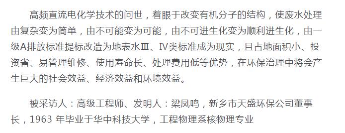 中國高新技術網發布:《關注:解碼科技創新》——新鄉市天盛環保“超強氧化還原廢水處理技術”